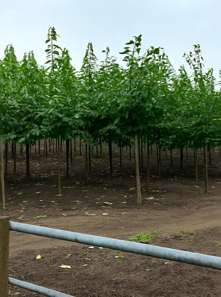 Prunus avium 'Burlat' / Süßkirsche 'Burlat' Hochstamm 16-18 StU mit Drahtballen, Bäume in Reihen im Feldbestand.