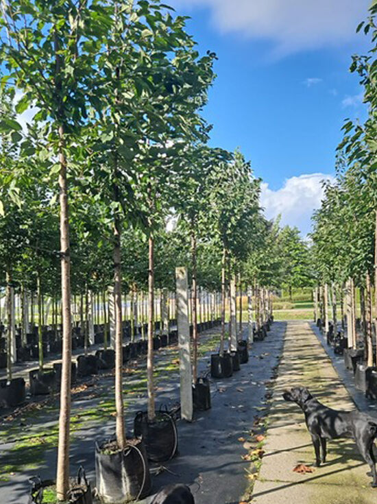 Prunus avium „Große Prinzessin“ (Süßkirsche) „Napoleon“ Hochstamm 10–12 StU im Container, Reihe junger Bäume in Baumschule.