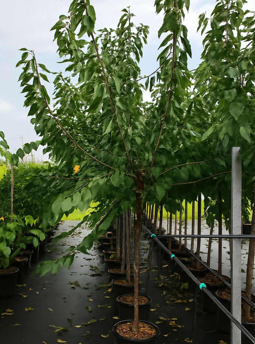 Prunus avium 'Regina' / Süßkirsche 'Regina' als junger Hochstamm im Topf, schlanker Stamm mit verzweigter Krone und Laubaustrieb.
