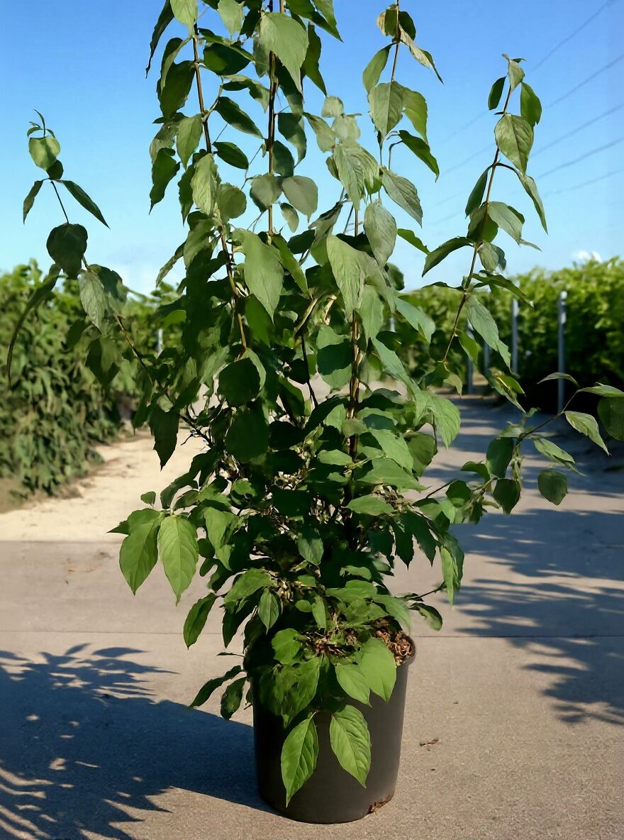 | Wuchs: | Mittelgroßer Strauch, aufrecht wachsend, locker verzweigt, 3 bis 4 m hoch und bis zu 3 m breit |