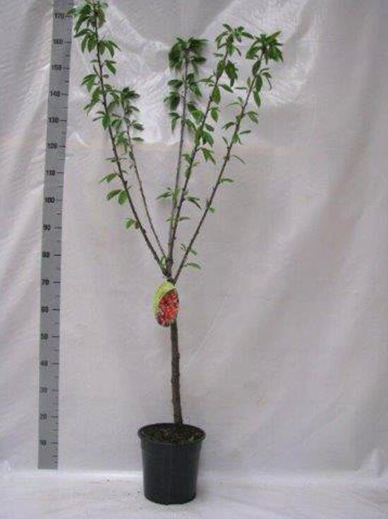 Süßkirsche Prunus avium 'Dönissens Gelbe Knorpelkirsche' als junger Hochstamm im Topf, veredelter Stamm mit Krone ohne Laub.