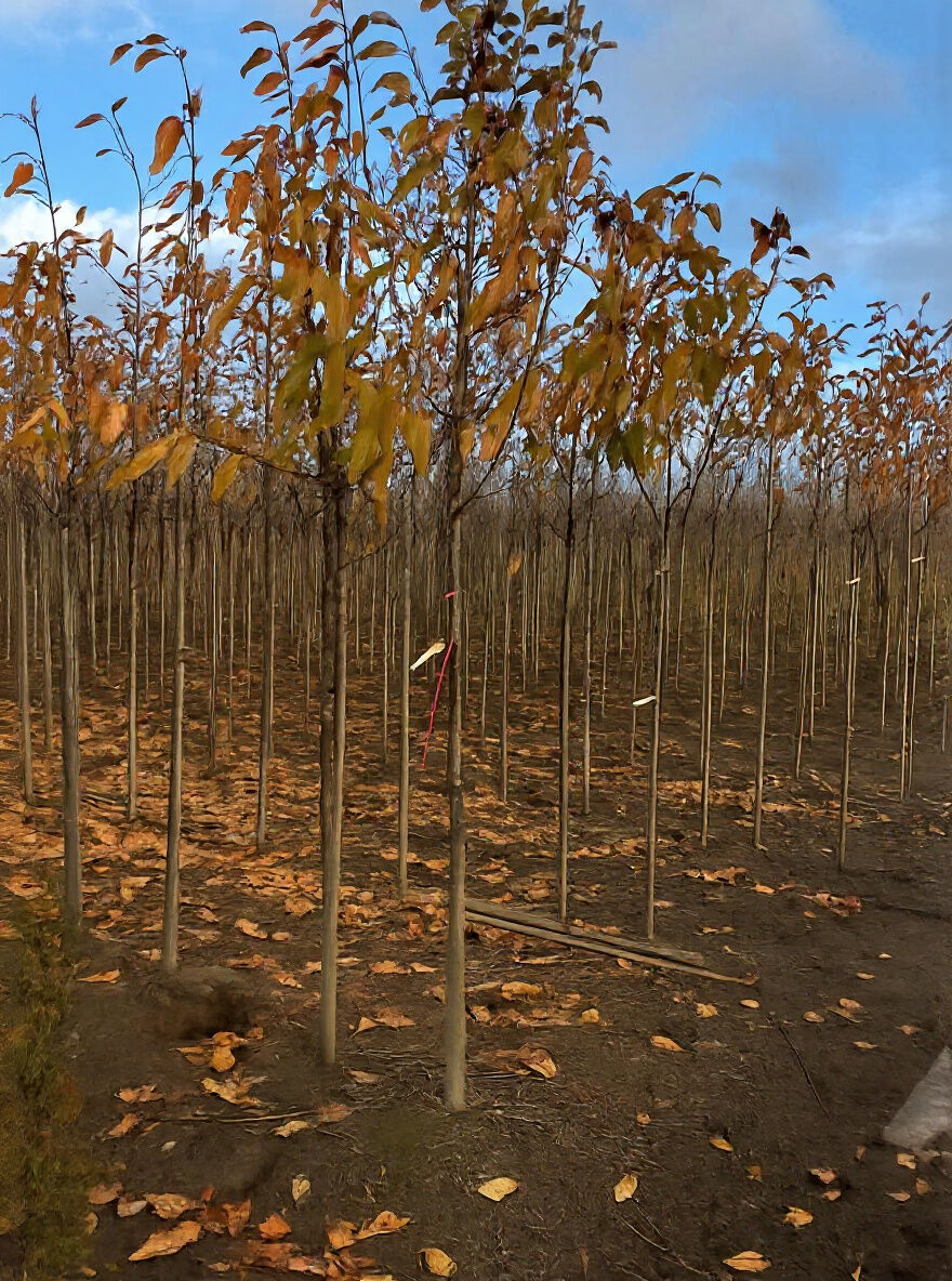 Süßkirsche Prunus avium 'Dönissens Gelbe Knorpelkirsche' Hochstamm 12-14 StU mit Drahtballen in Baumschulreihe