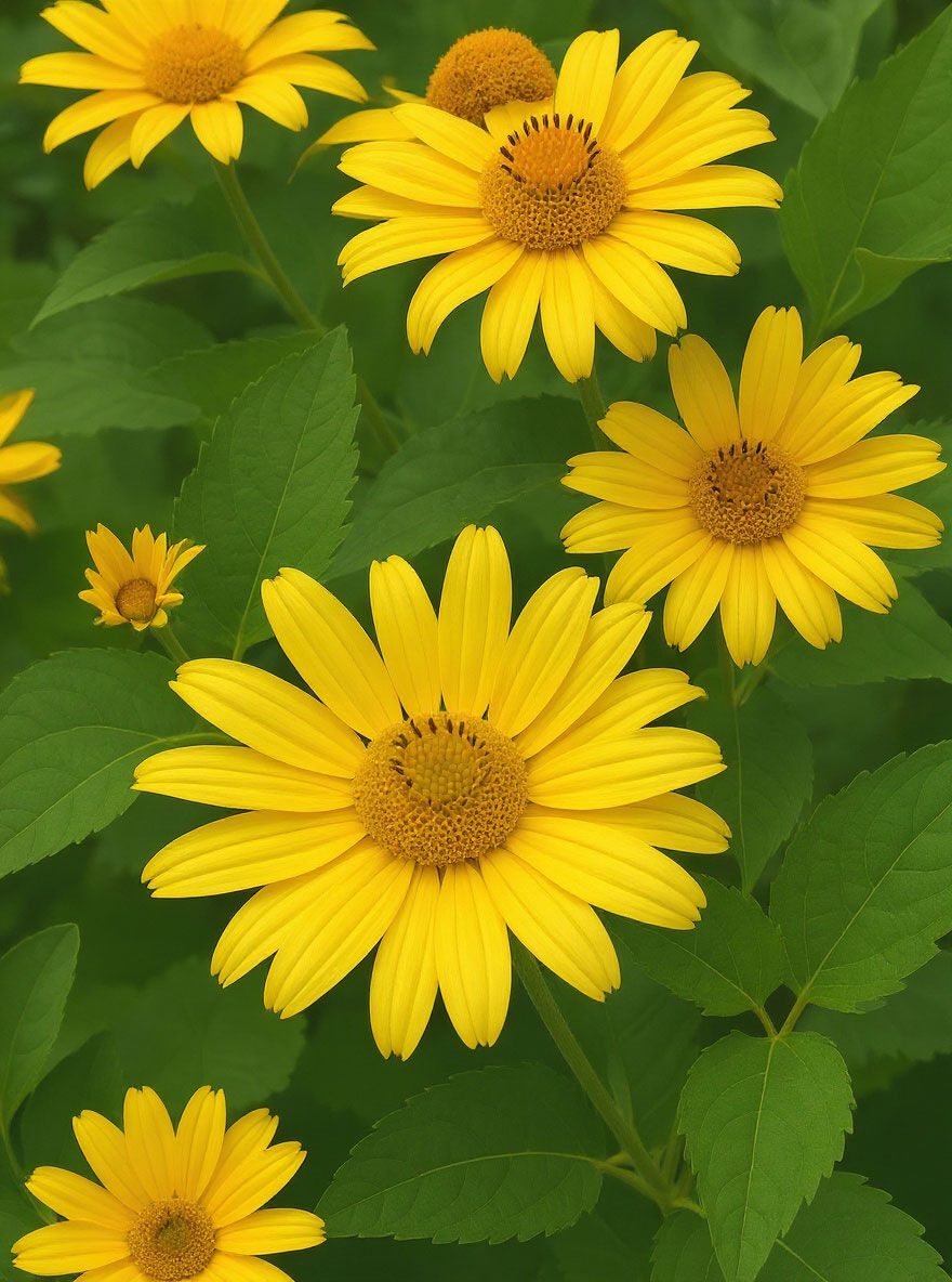 | Blüte: | Leuchtend gelb, körbchenartig, ähneln Sonnenblumen, großblumig, zahlreich |