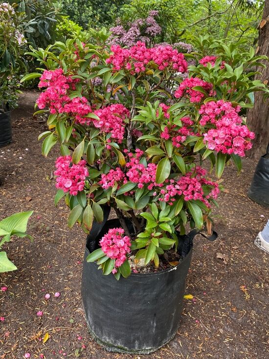 Kalmia latifolia 'Kaleidoscope' (Lorbeerrose/Berglorbeer) im Topf, immergrüner Strauch mit rosa Blüten und glänzendem Laub.