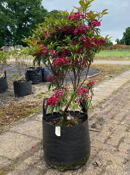 Kalmia latifolia 'Kaleidoscope' (Lorbeerrose/Berglorbeer) 50–60 cm, Solitär im Topf, mit pinken Blüten und grünen Blättern