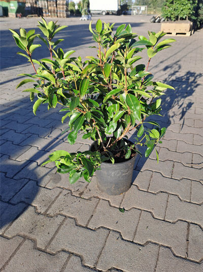 | Blatt: | Immergrün, lorbeerblattähnlich, lanzettlich bis elliptisch, mit langgezogener Spitze, ledrig, glänzend, mittelgrün bis dunkelgrün, 6 bis 10 cm lang |