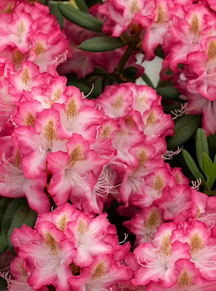Rhododendron 'Campanile' ist bekannt für seine prächtigen Blüten. Die Blüten sind trichterförmig und haben eine beeindruckende Größe von bis zu 15 Zentimetern. Die Blütenfarbe präsentiert sich in einem Purpurrosa, innen weißer Saum mit olivgrüner Zeichnung. Die Blütezeit des Rhododendron 'Campanile' fällt in den Monaten Mai und Juni. Die Blüte ist reichlich und bedeckt die Pflanze vollständig, was ein herrliches Schauspiel bietet.