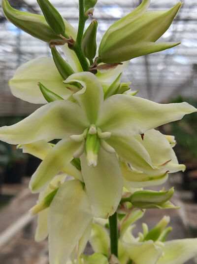| Blüte: | Cremeweiß, glockenförmig, 4 bis 8 cm breit, an bis zu 2 m hohen und rispenartigen Blütenständen, zahlreich und sehr zierend. |