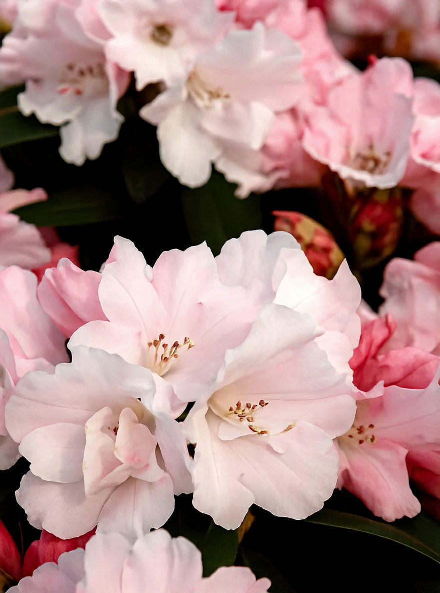 Die Blüten des Rhododendron yakushimanum 'Mardi Gras' sind beeindruckend und ziehen im Frühjahr viele Blicke auf sich. Sie haben einen Durchmesser von etwa 5 bis 7 cm und erscheinen in großen Büscheln am Ende der Triebe. Die Blüten sind trompetenförmig und präsentieren sich in einer ansprechenden hellrosa bis zartrosa Optik und hellem Zentrum. Die Blütezeit erstreckt sich über den Mai, je nach Standort und Witterung.