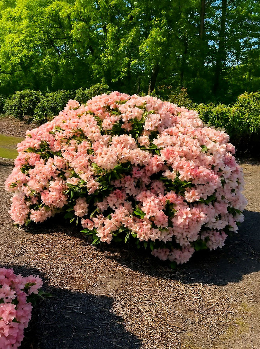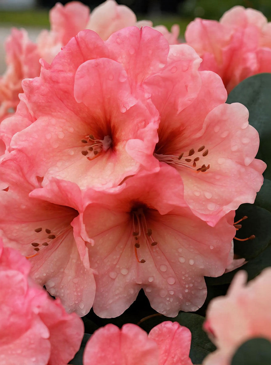 Der Rhododendron 'Marrakesch' ist besonders für seine atemberaubenden Blüten bekannt. Während der Blütezeit, die normalerweise im späten Frühling oder frühen Sommer liegt, verwandelt sich die Pflanze in ein wahres Farbenmeer. Die Blüten des 'Marrakesch' sind in einem lebendigen lachs- bis orangerosafarbenen Ton gehalten und bilden einen starken Kontrast zu dem dunkelgrünen Laub. Jede Blüte besteht aus einer Vielzahl von Blütenblättern und verströmt einen angenehmen Duft, der Bienen und Schmetterlinge anzieht. Die leuchtenden Blüten machen den 'Marrakesch' zu einem Blickfang in jedem Garten.