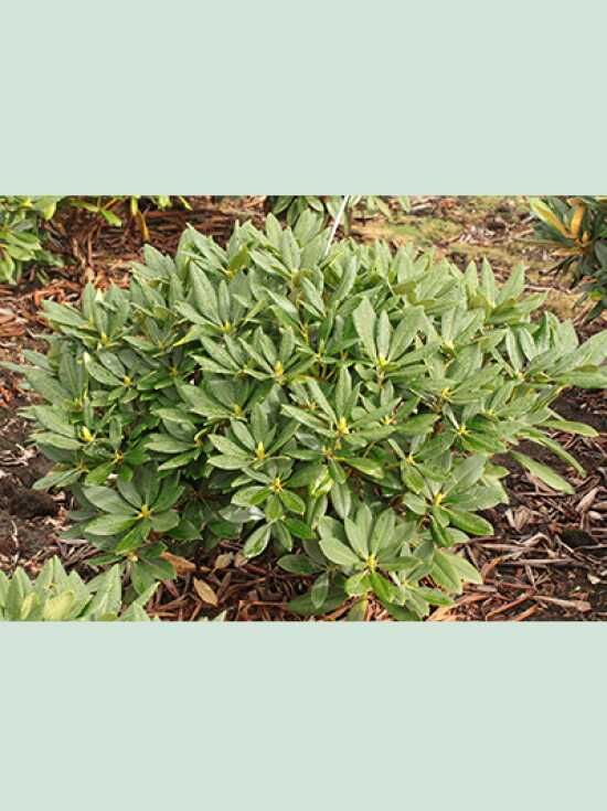 Rhododendron 'Marrakesch' (Rhododendron yakushimanum) mit grünen, schmalen, lanzettlichen Blättern im dichten Wuchs.