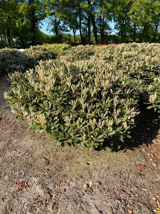 Die Blätter des Rhododendron 'Silvervelours' sind auffällig silbergrau und haben eine samtige Textur, was der Pflanze ein luxuriöses Aussehen verleiht. Die Kombination aus der silbernen Blattfarbe und der attraktiven Blütenpracht macht den Rhododendron 'Silvervelours' zu einer sehr beliebten Pflanze in Gärten und Parks.