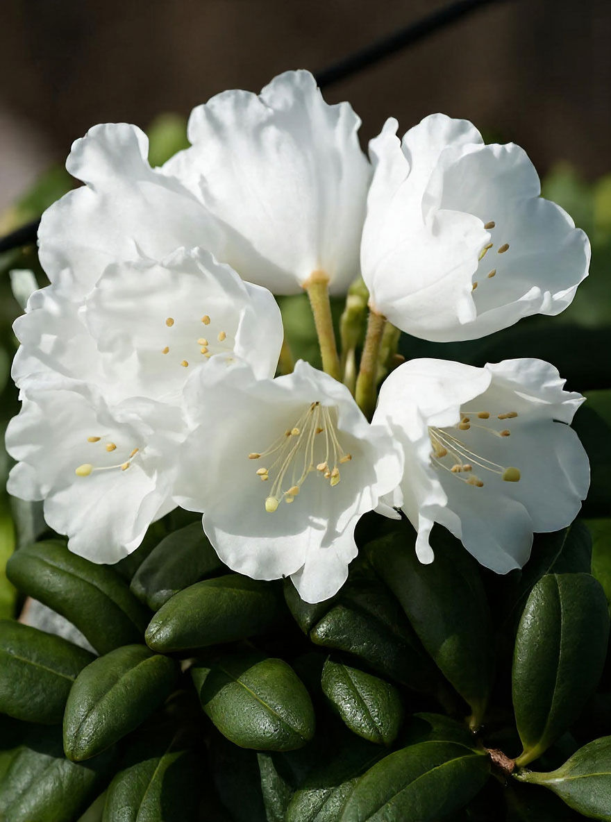 Der Rhododendron yakushimanum 'Schneekissen' auf Stamm trägt von Mai bis Juni zahlreiche, strahlend weiße Blüten mit grüngelber Zeichnung, die in großen Dolden angeordnet sind. Die Blüten sind trichterförmig und haben eine angenehme Duftnote, die den Garten im Frühling mit einem zarten Aroma erfüllt.