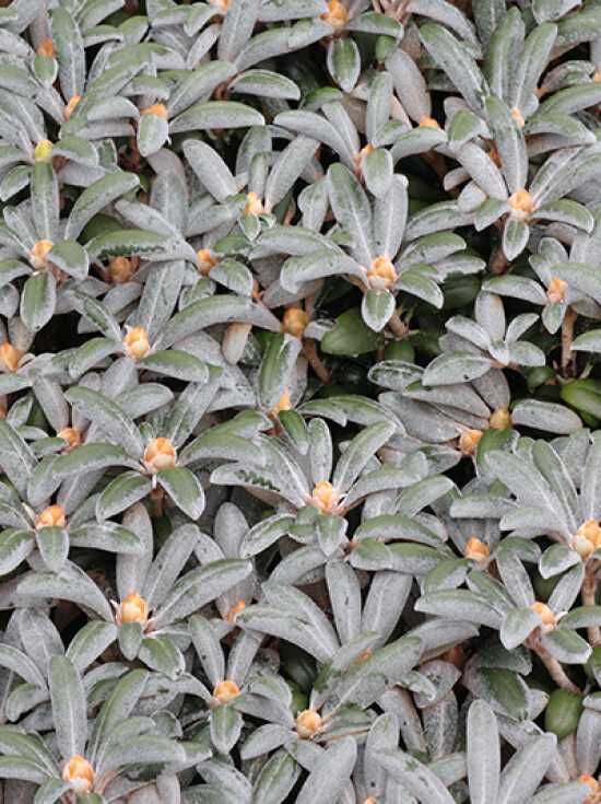 Die Blätter des Rhododendron yakushimanum 'Schneekissen' auf Stamm sind dunkelgrün, ledrig und glänzend. Sie sind länglich und haben einen leicht gewellten Rand. Die Blätter sind immergrün und bleiben auch im Winter an der Pflanze. Die Unterseite der Blätter ist silbrig behaart, was einen attraktiven Kontrast zum dunklen Grün der Blattoberseite bildet.