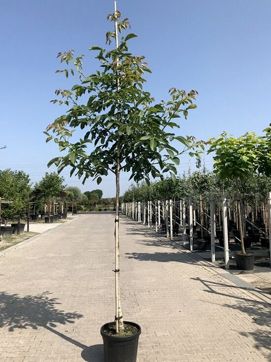 Die Selektion ’Broadview‘ ist ein populärer Zierbaum, der sich aufgrund seiner geringeren Endhöhe gut für die Verschönerung von Hausgärten eignet. Die Juglans regia’ Broadview‘ wächst malerisch mit einer runden sowie breiten Krone und schafft für den Gärtner idyllische Schattenplätze. Sie weiß im gesamten Gartenjahr zu erfreuen, verzaubert im Sommer mit ihrem frischen Blatt und im Herbst mit einer warmen Laubfärbung. Besonders schmackhaft ist die Frucht im Herbst, die sich in großer Zahl an der Krone bildet. Für den besten Fruchtertrag sollte die Züchtung ’Broadview‘ mit einer anderen Züchtung zusammen gepflanzt werden, dann erfolgt eine ausreichende Bestäubung. Diese Walnusszüchtung ist somit optisch ein echtes Highlight und zeigt sich zudem robust, genügsam und pflegeleicht. Sie kommt am schönsten in solitärem Stand zur Geltung und eignet sich als Garten- sowie Parkbaum, aber auch als charismatischer Alleebaum.