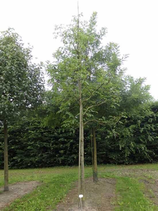 Gemeine Walnuss (Juglans regia) 'Broadview' als junger Baum in einer Baumschulreihe, mit dichtem grünem Laub.