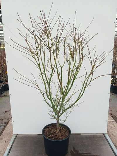 Acer palmatum 'Jerre Schwartz' / Fächer-Ahorn 'Jerre Schwartz' im Topf, mehrtriebige Jungpflanze mit kahlen Zweigen.