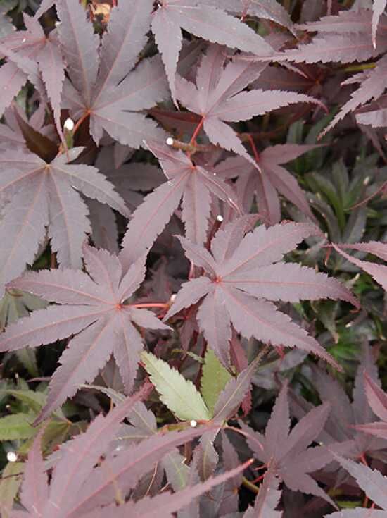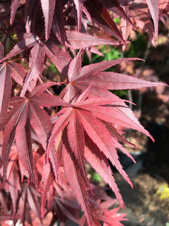| Blatt: | Sommergrün, handförmig geteilt, fünf- bis siebenlappig, tief geschlitzt, am Ende zugespitzt, gezahnter Rand, seidenmatter Glanz, im Austrieb leuchtend rot, später dunkelrot, im Herbst scharlachrot, ca. 10 cm groß |