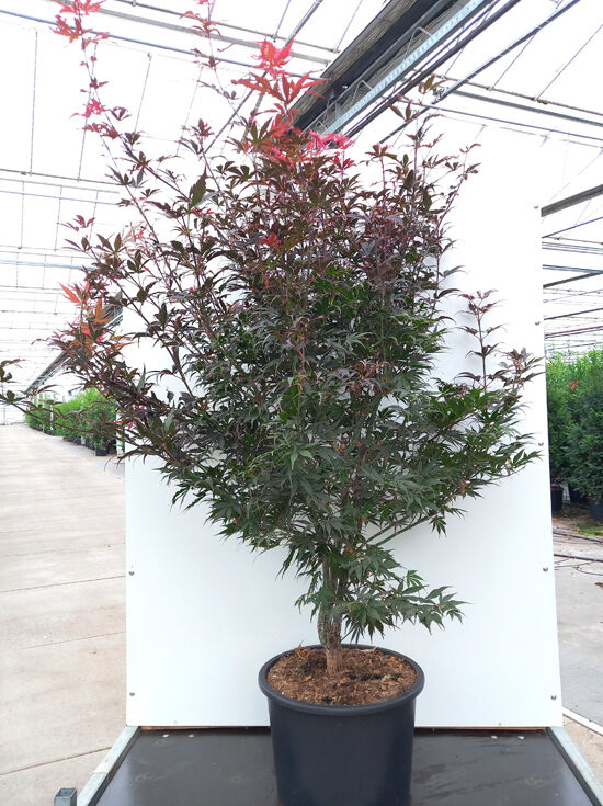 Fächer-Ahorn Acer palmatum 'Pixie', 175-200 cm, C35, im Pflanzcontainer mit aufrechtem Stamm und rotgrünem Laub.