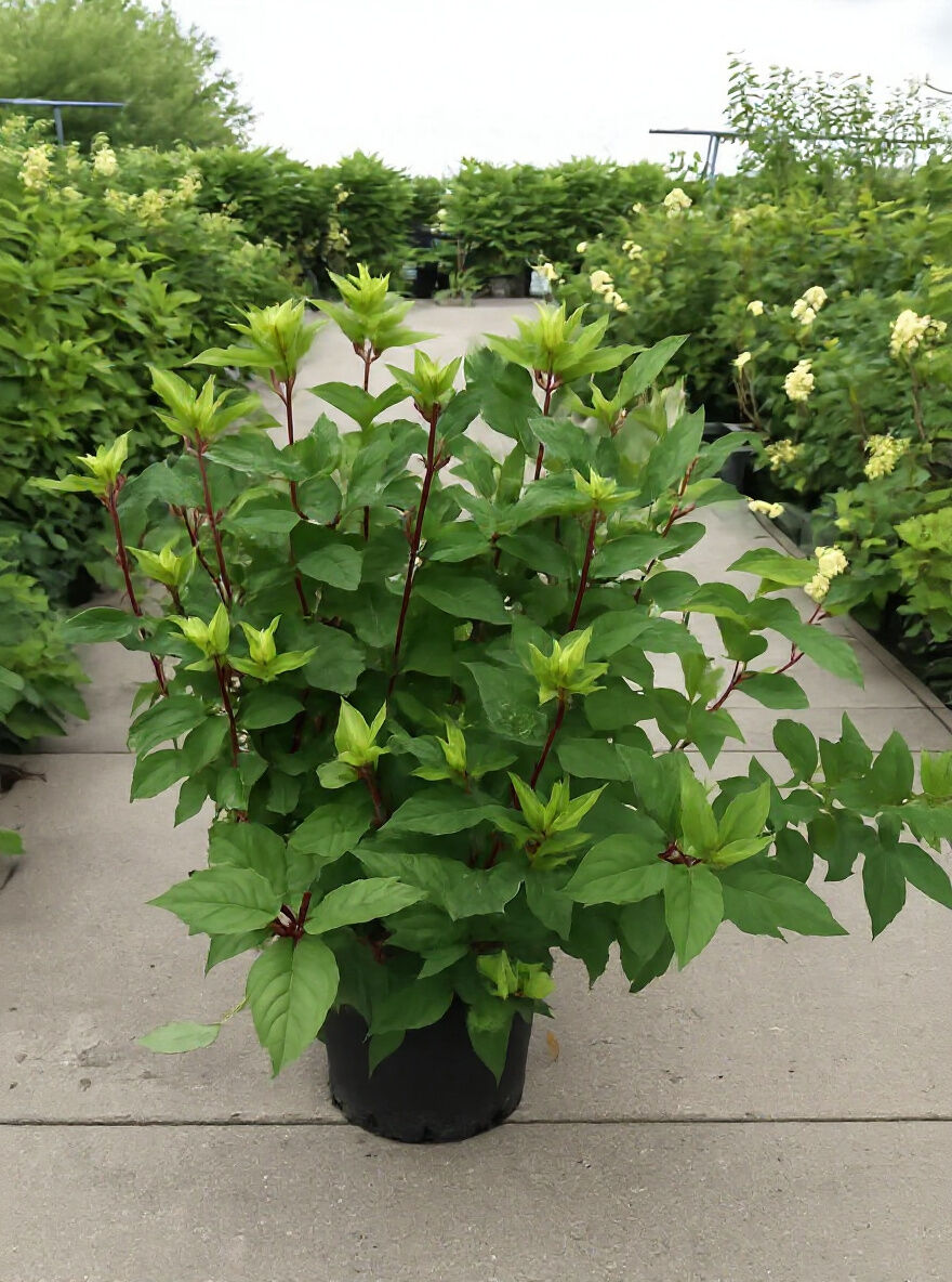 Rispenhortensie Hydrangea paniculata 'Wim's Red' im Topf mit grünen bis gelblichen Blättern und rötlichen Trieben.