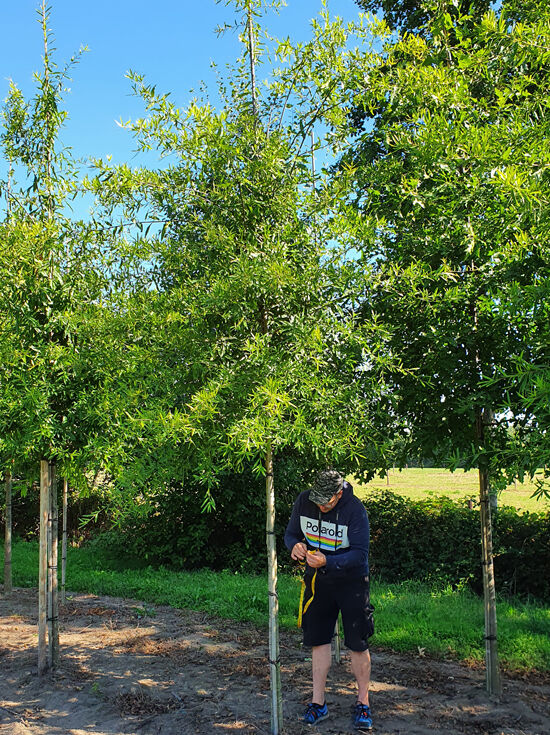 Quercus phellos (Weiden-Eiche), Hochstamm 18-20 StU m. Db., Baum mit schmalen weidenartigen Blättern und Stammstützen