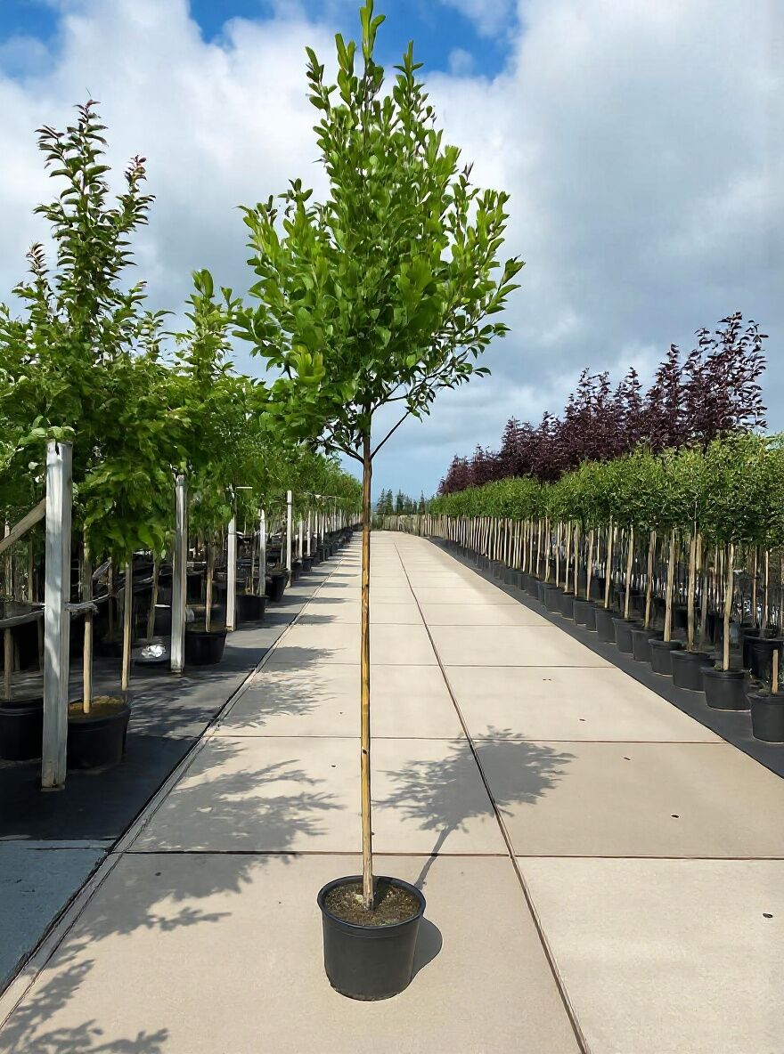 Säulenförmige Felsenbirne (Amelanchier canadensis 'Rainbow Pillar') als Hochstamm im Topf mit schlankem Wuchs und grünem Laub.
