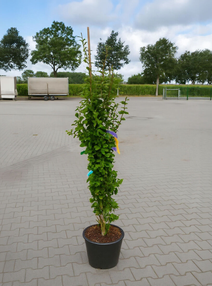 Parrotia persica 'Persian Spire', säulenförmiger Eisenholzbaum, 100-125 cm, C12, im schwarzen Pflanztopf mit grünem Laub