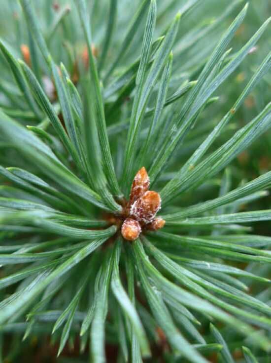 | Blatt: | Immergrün, Nadeln, dichtstehend, 2-nadelig, leicht gewölbt, graublau, ca. 3 cm lang |