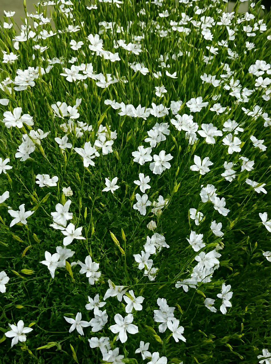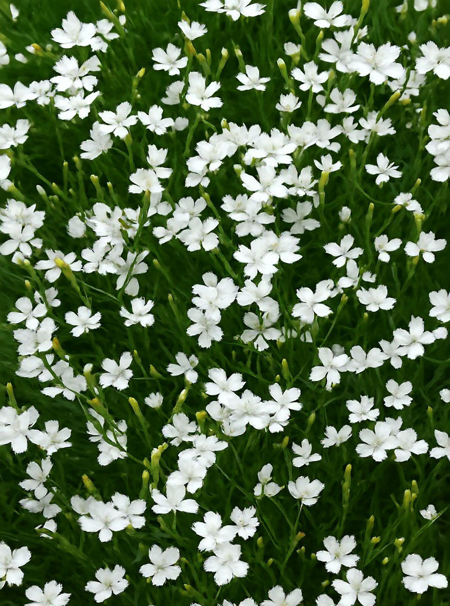 Garten-Heide-Nelke 'Albus' (Dianthus deltoides) mit zahlreichen weißen Blüten und schmalen grünen Blättern