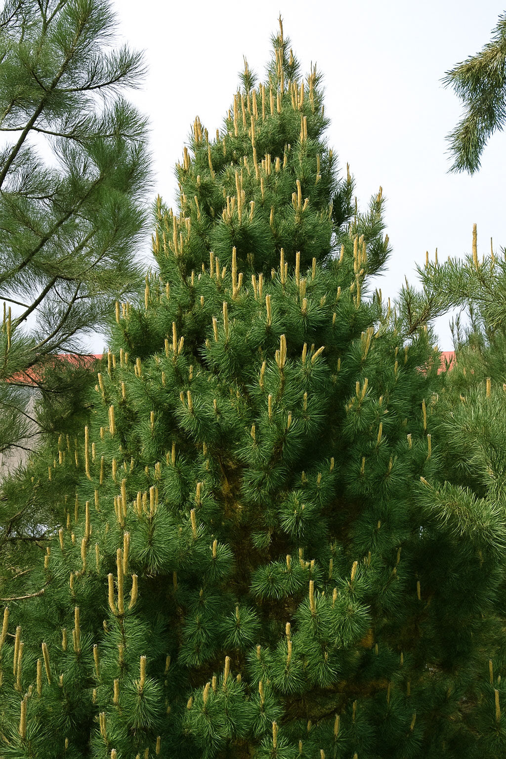 Blatt: | Immergrün, Nadeln, 2-nadelig, radial stehend, tiefgrün. |