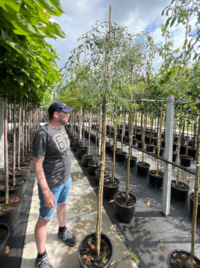 Pyrus salicifolia 'Pendula' / Weidenblättrige Hänge-Birne 'Pendula' als Hochstamm im großen Pflanzcontainer in Baumschule.
