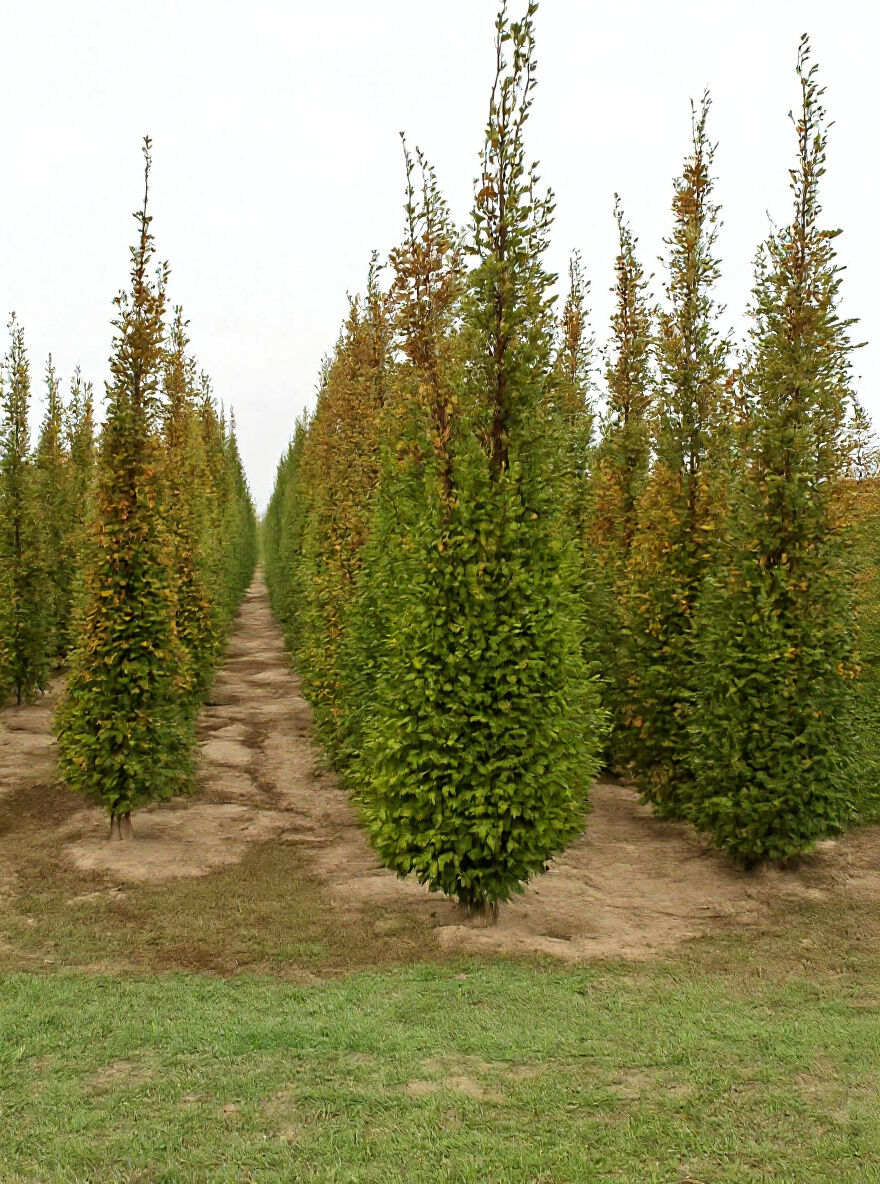 Säulen-Hainbuche (Carpinus betulus 'Fastigiata') 400–450 cm mit Durchtrieb, schlanker säulenförmiger Laubbaum in Reihe im Feld.