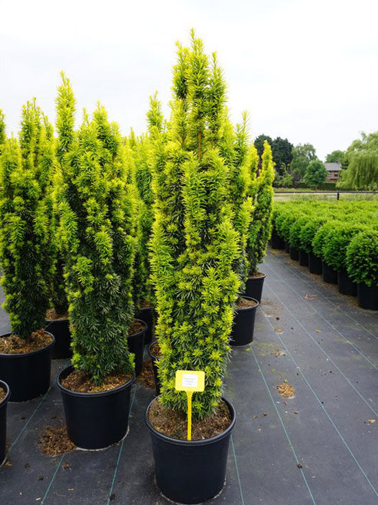 Taxus baccata 'David' / Gelbe Säulen-Eibe 'David' als säulenförmige, gelbgrüne Nadelgehölze im Pflanztopf.