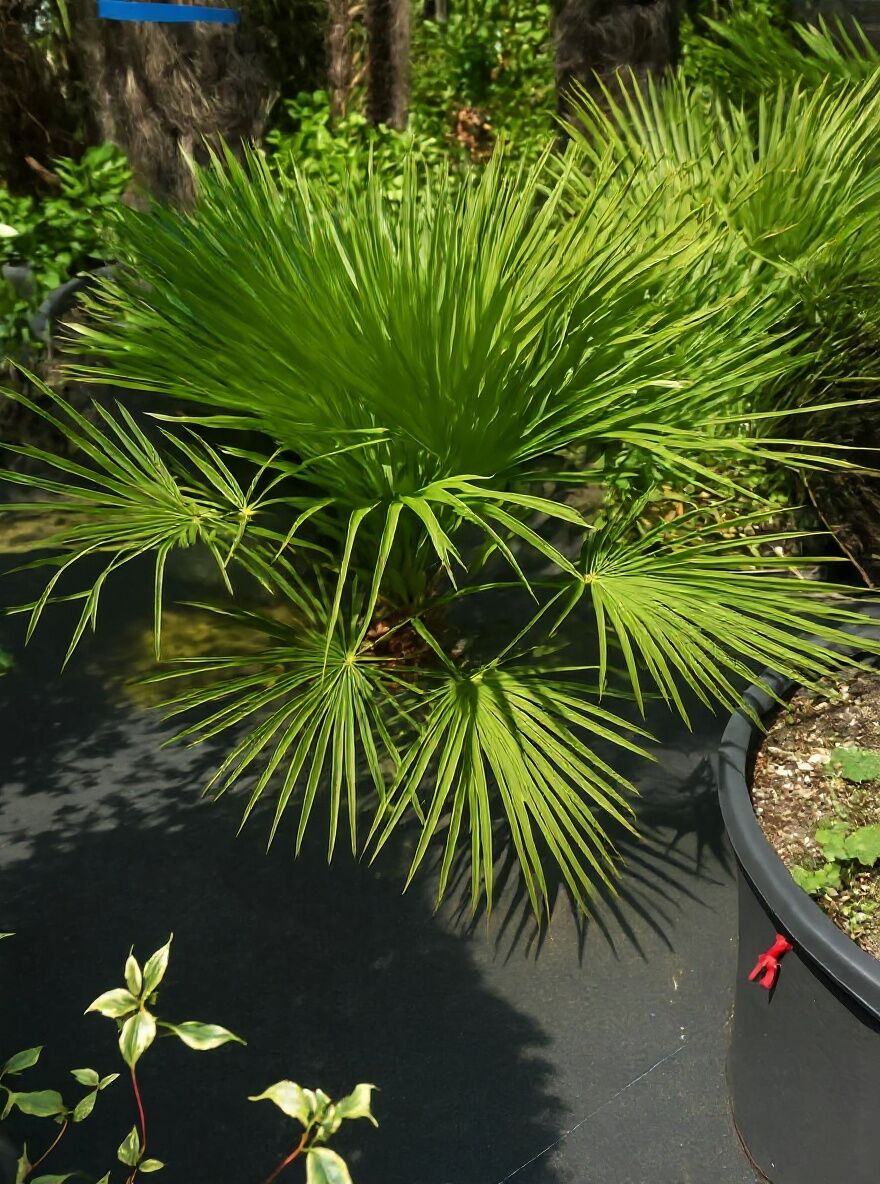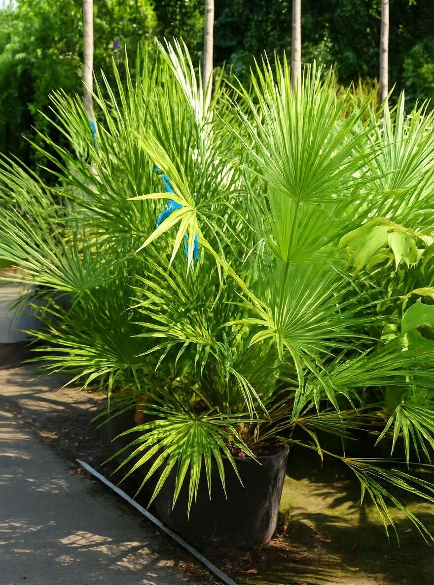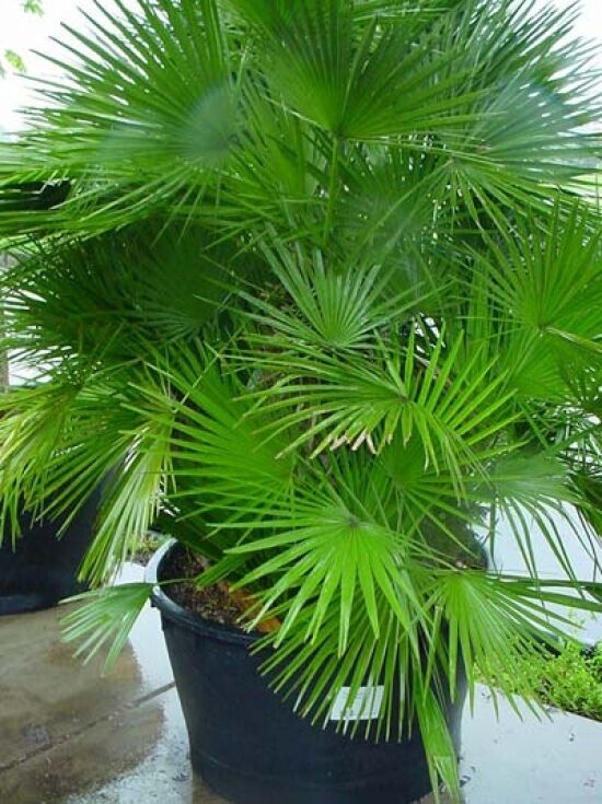 | Blatt: | Immergrün, Palmwedel, schmal-länglich, tief geschlitzt, am Ende zugespitzt, steif und hart, grün oder grau- bis blaugrün, Blattstiele bedornt, Wedel ca. 55 cm lang. |