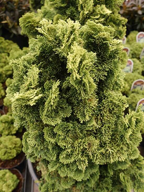 | Wuchs: | Zwergkonifere, aufrecht, buschig, kompakt, kugel- bis kegelförmig, muschelförmig gedrehte Zweige, 80 bis 100 cm hoch und bis zu 60 cm breit |