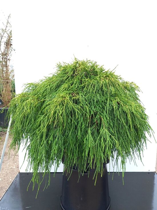 Wuchs: | Kleinstrauch, flachkugelig wachsend, fadenförmige, überhängende Bezweigung, bis zu 1,5 m hoch und doppelt so breit, extrem langsam wachsend |