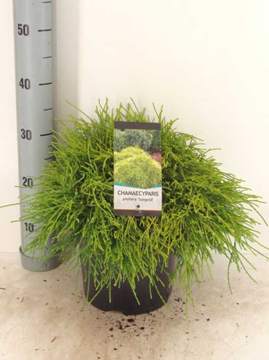 Gelbe Fadenzypresse 'Sungold' (Chamaecyparis pisifera 'Sungold') 30-40 cm (breit) im schwarzen C5-Topf mit Pflanzenetikett