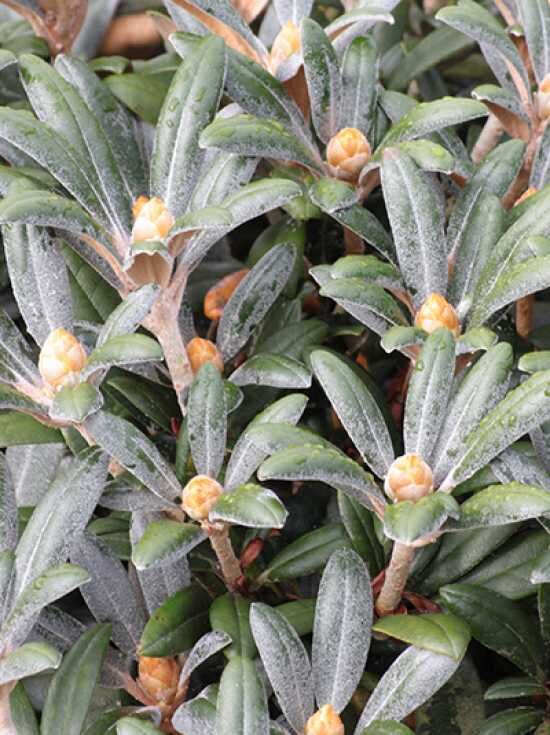 Rhododendron yakushimanum 'Best Dane' (Rhododendron 'Best Dane') mit graugrünen, ledrigen Blättern und Knospen in Nahaufnahme.