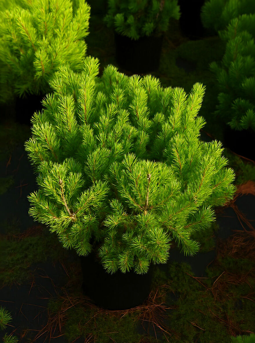 Pinus mugo pumilio (Zwerg-Kiefer) im Topf, kompakter buschiger Wuchs mit dichten grünen Nadeln und aufrechten Austrieben.