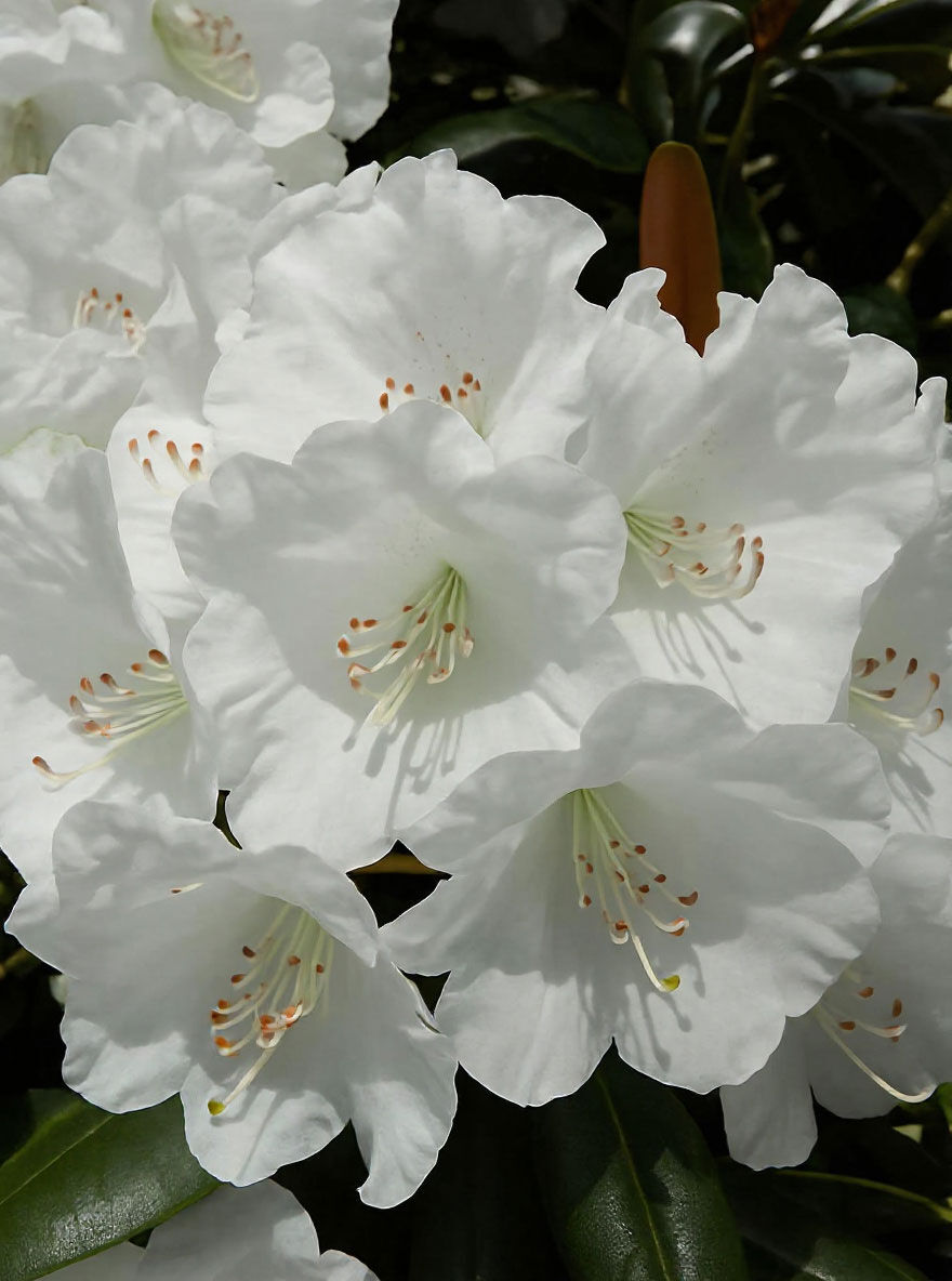 Die Blüte des Rhododendron 'White Dane' ist atemberaubend. Die Blüten sind trichterförmig und groß, mit einem Durchmesser von etwa 5 bis 7 cm. Sie sind weiß gefärbt und haben einen Hauch von Rosarot an der Basis der Blütenblätter. Die Blütezeit des Rhododendron 'White Dane' erstreckt sich über den Mai. Die Blütenpracht hält etwa 2 bis 3 Wochen an und zieht viele Bienen und Schmetterlinge an.
