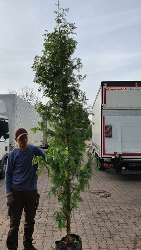 Der gut gewachsene Urweltmammutbaum, wurde uns wie angekündigt geliefert. Der Baum war sicher verpackt und sieht ausgepackt und eingepflanzt auf unserm Grundstück richtig gut aus.