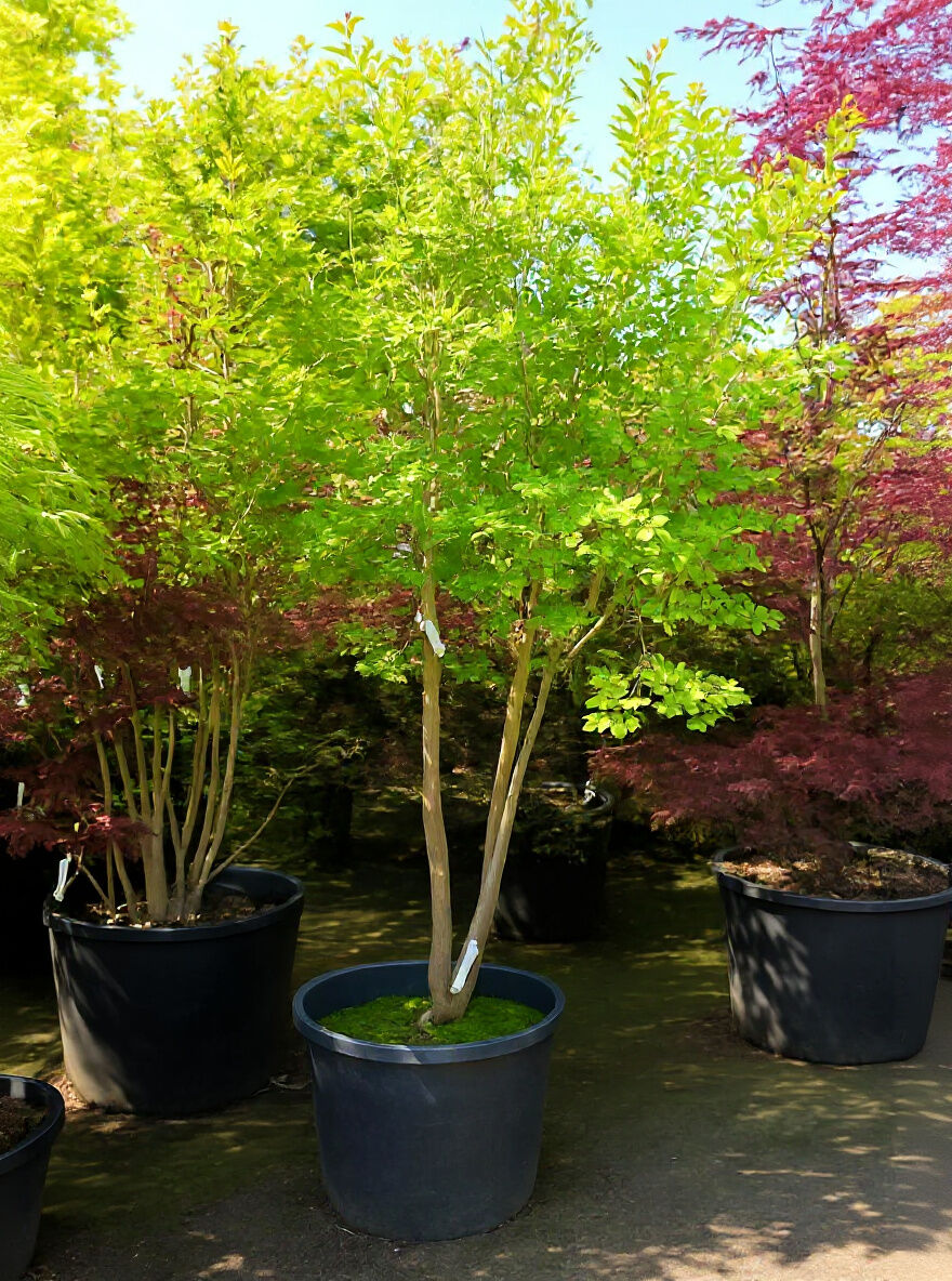 Der Stamm der Kreppmyrte betont seine fernöstliche Erscheinung, Die Rinde ist zunächst auffallend glatt und schimmert in einem gräulichen Braun. Sie wird dann aber deutlich markanter und präsentiert sich mit dekorativ abblätternden Rindenplatten. Dies verleiht dem Stamm eine exotische Optik und bringt einen Hauch von Asien nach Europa.