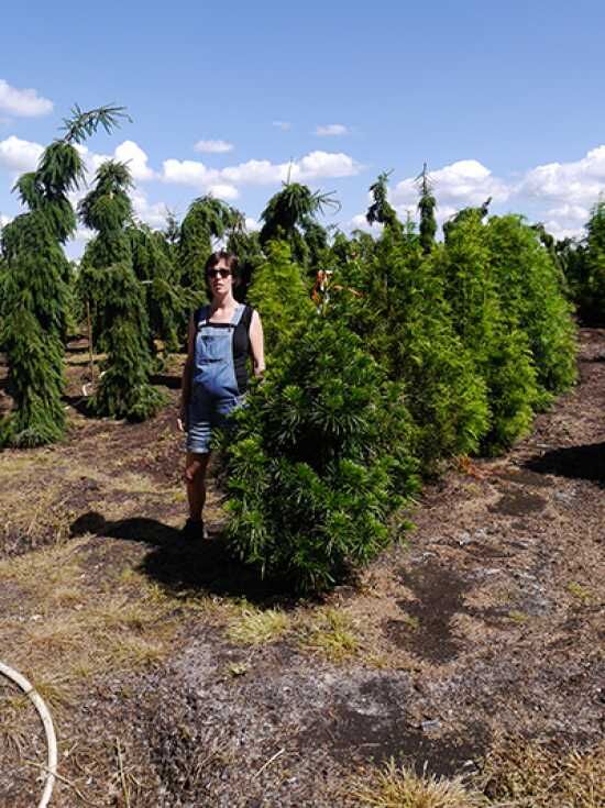 Sciadopitys verticillata (Schirm-Tanne) Solitär 125–150 cm mit DB, dichter immergrüner Wuchs in Baumschulquartier