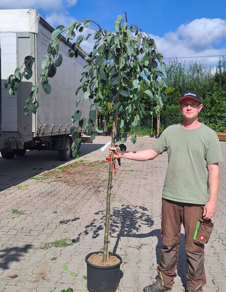 Cercidiphyllum japonicum 'Pendulum', Judasblatt 'Pendulum' im Topf, Hochstamm mit überhängenden Trieben und herzförmigen Blättern.