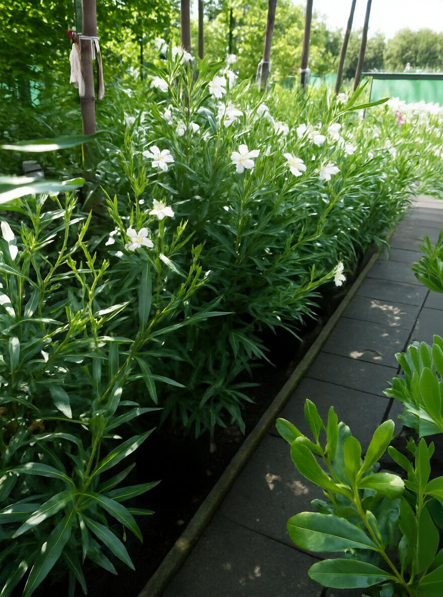 Nerium oleander (Oleander/Rosenlorbeer) als großer Strauch mit zahlreichen weißen Blütenständen und schmalen, lanzettlichen Blättern