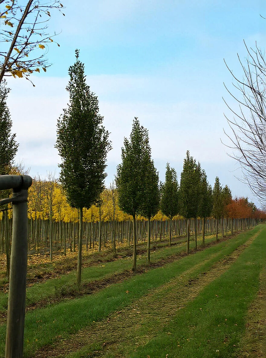Quercus robur 'Fastigiata' Hochstamm 20-25 StU m. Db., Säulen-Eiche/Pyramiden-Eiche als Baumreihe in der Baumschule