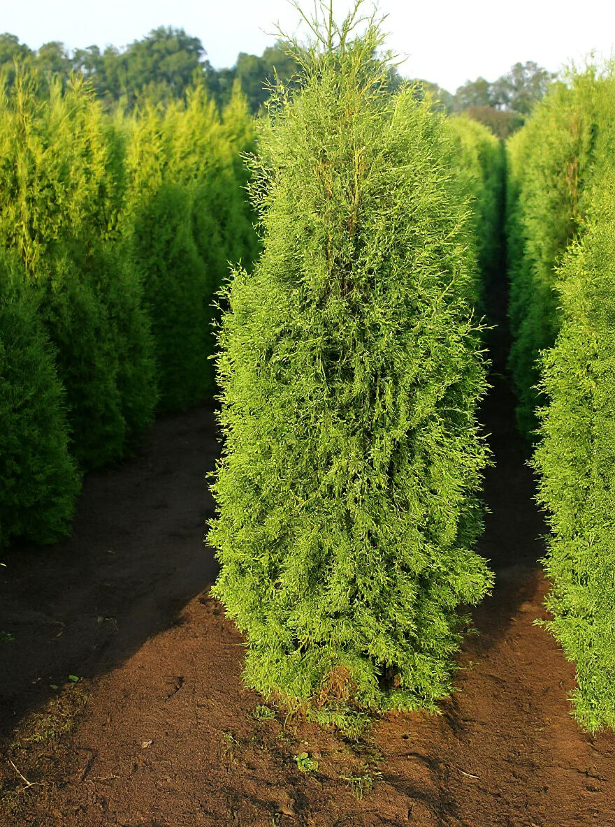 Thuja occidentalis 'Columna' / Säulen-Lebensbaum 'Columna', schlanke, aufrecht wachsende Nadelgehölze in Reihen auf dem Feld