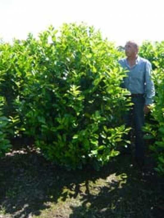 Prunus laurocerasus 'Rotundifolia' – Kirschlorbeer 'Rotundifolia', großblättriger Kirschlorbeer als Feldkultur in Reihen