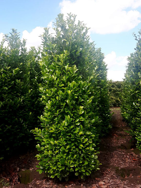 Prunus laurocerasus 'Rotundifolia' – Kirschlorbeer 'Rotundifolia', großblättriger Kirschlorbeer als Feldkultur in Reihen