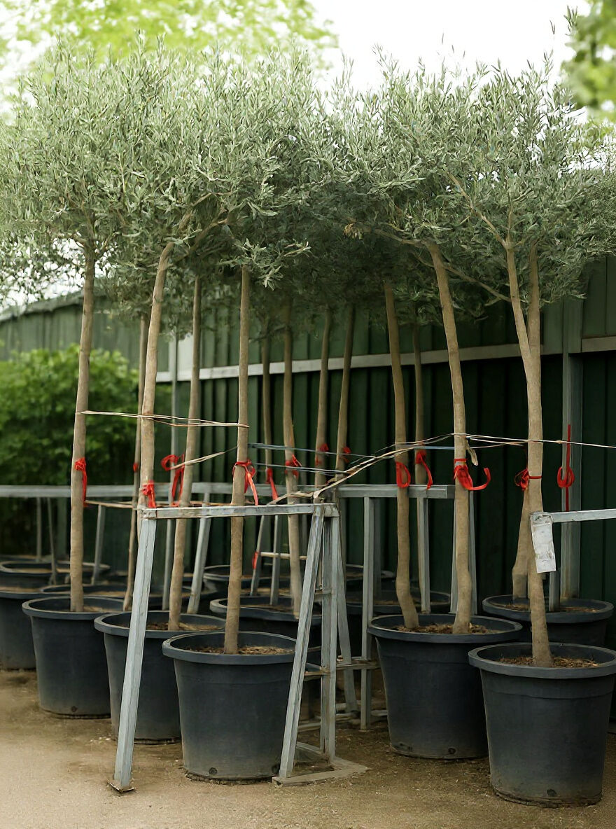 Olea europaea (Olivenbaum) Hochstamm im Container, mehrere Bäume mit geradem Stamm und dichter Krone in Töpfen.